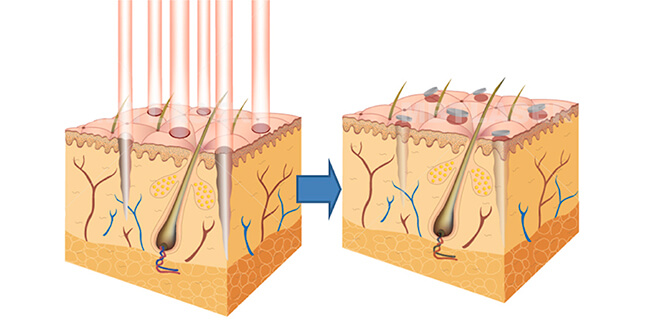 Благодаря фототермическому (тепловому) воздействию происходит стимулирование восстонавления кожи, генерации коллогеновых и эластиновых волокон.